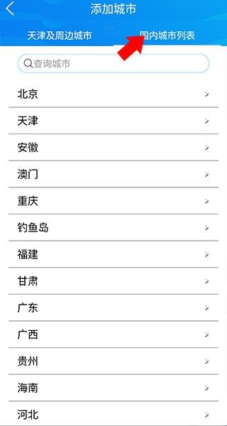 3、来到下方界面后,如果想要添加其他地区城市则点击上方“国内城市列表”并使用搜索功能查询即可
