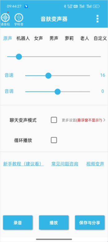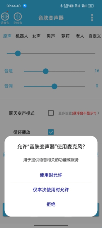 1、进入安卓变声器App后,先在设置中开启【聊天变声模式】和【循环播放】功能;