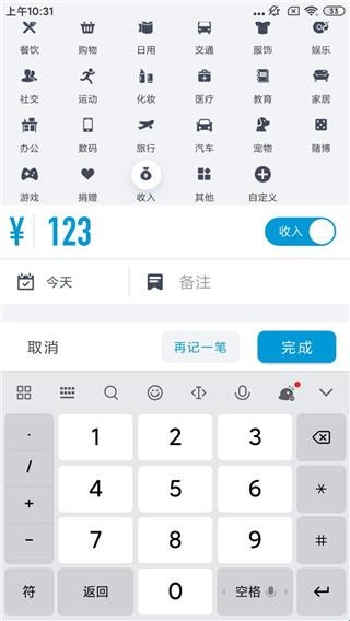 4、选择上方分类,输入金额,点击右边还可自由切换消费或是收入,点击完成即可