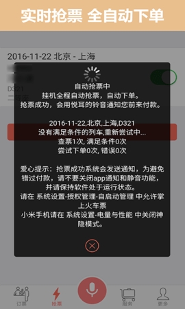 2、实时抢票,全自动下单,并显示了查票次数、下单次数等,也有相应的爱心提示;