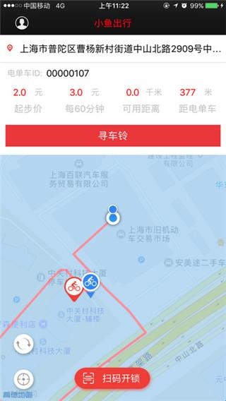 2、根据地图上的显示找到最近的共享电单车的位置,扫码解锁。同时也支持编码解锁哦!