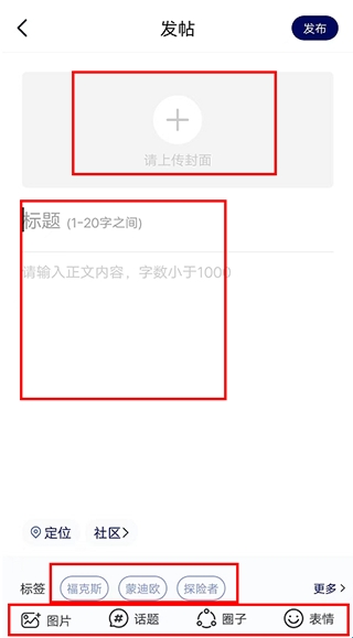 3、进入帖子编辑页面,上传封面图,完善帖子内容;可选择参与的话题、圈子(只能选择自己创建的圈子或已加入的圈子,若未创建或加入任何圈子,则直接选择发布到广场或不做任何选择)、定位等,也可选择不参与,填写完成,点击右上方【发布】即可。
