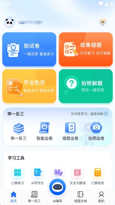 1、打开试卷100App,在首页有拍试卷、收集错题、作业批改以及拍照解题等一众学习工具;