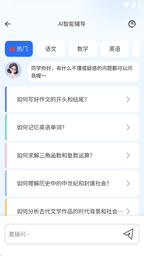 4、有任何学习上的问题可以直接在AI辅导页向您的专属AI辅导老师提问;
