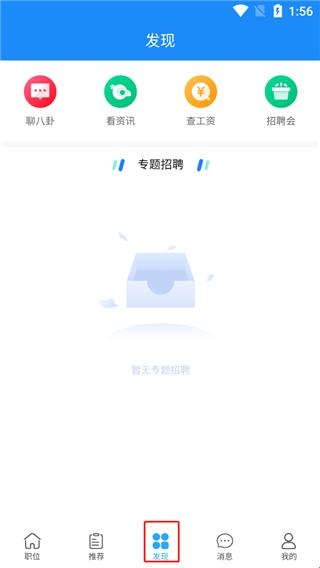 4、点击发现,里面为用户提供了聊八卦、看资讯、查工资、招聘会等等功能;