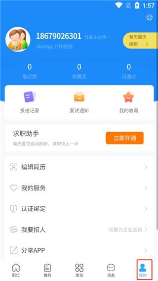 6、点击我的,里面提供编辑简历、我的服务、我要招人、投递记录、面试通知等信息。