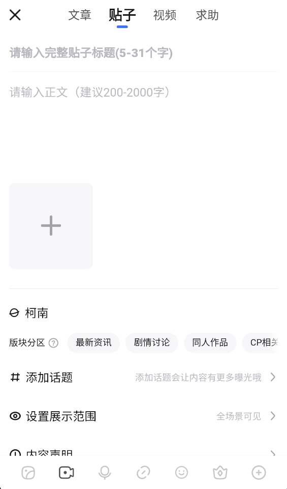 2、你可以输入帖子的标题、正文,添加图片和话题,选择版块,或者设置展示范围。
