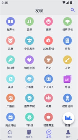 拥有文学名著、有声小说、曲艺戏曲、名家评书、儿童文学、外语学习、时事新闻、搞笑段子、健康养生、广播剧、职业技能等十几个大类海量高清有声阅读资源,每天都有新的资源更新发布。