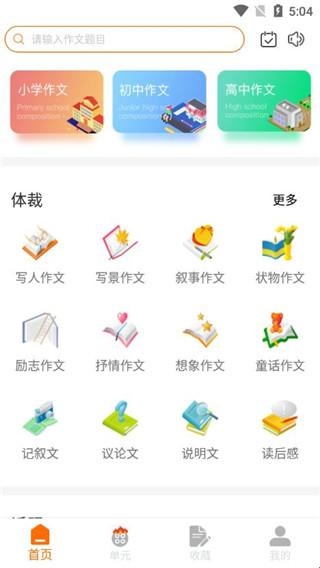 2、首页有小学作文、初中作文、高中作文等,各种题材作文都能在线阅读