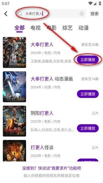 比如搜索大奉打更人,找到对应的电视剧,点击后面的“立即播放”;