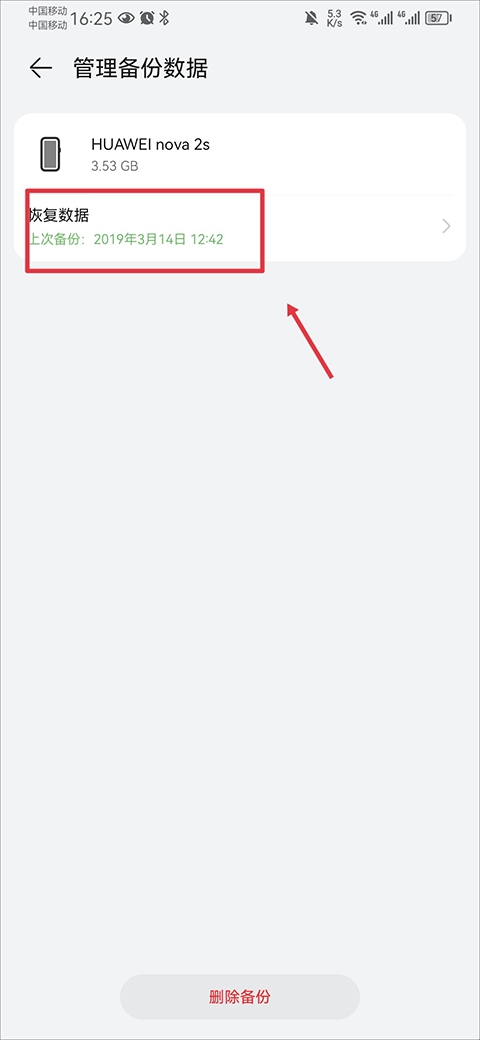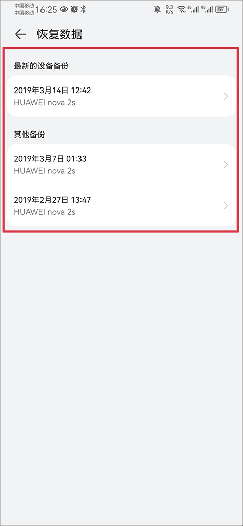 3、然后在恢复数据中的所有备份时间中,选择一个进行恢复。