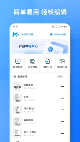 米多印标签APP是一款方便好用的商品标签编辑软件,干净明了的页面设计轻松编辑更加易于大家使用,还有详细的教程可以给到用户学习。用户可以根据自己的需求来自由编辑,提供的元素也是十分的丰富,还有超多的模板可以一键套用。该软件是支持图片或者PDF打印的,有需要的小伙伴就快来下载体验吧!