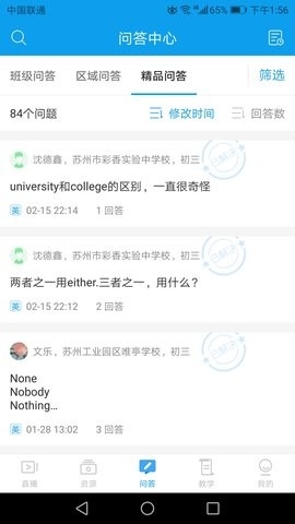 2、资源:主要分为我的资源、校本资源、区域资源三个模块,包括视频、文档、测验、题库等资源,查看资源页面可以评论、点赞、收藏等