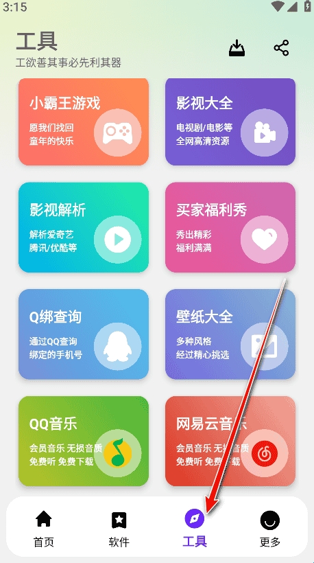 3、点击工具,会看到有着小霸王游戏、影视大全、影视解析、壁纸大全等板块内容,大家想用哪个板块就直接点击使用就好。