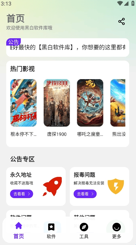 1、打开黑白软件库,可以看到首页是热门影视专区和公告专区。
