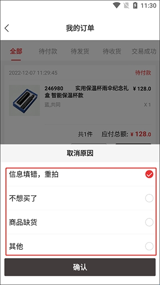 5、这边会出现一个取消原因,可以根据自己的需求进行选择。