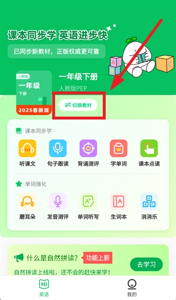 在本站下载安装打开英语朗读宝app后,进入英语主页点击切换教材