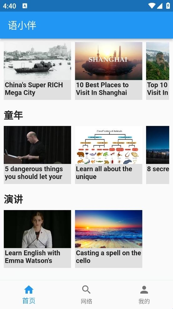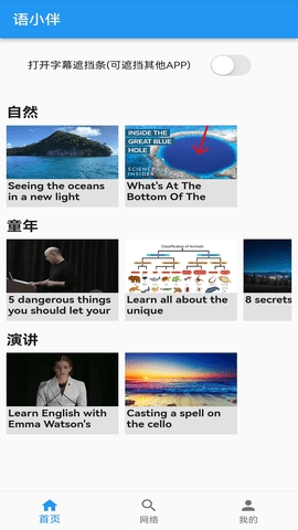 语小伴是辅助用户学习英语的优质软件,软件会根据一些国外的影视作品经过遮挡字幕来让孩子更好的学习英语,首先用户可以双语字幕观看,在切换传英文字幕,反复观看,学习英语。除了内置视频,你也可以开启字幕悬浮条来遮挡自己手机上其他的视频软件,学习外语,有需要的用户抓紧时间下载吧!