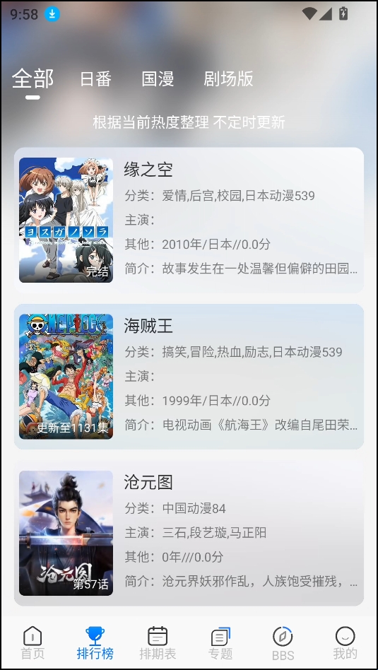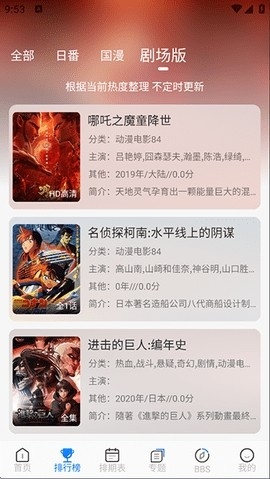 2、在排行榜界面下,我们能够看到各种类型的日番、国漫、剧场版的实时排行榜情况。