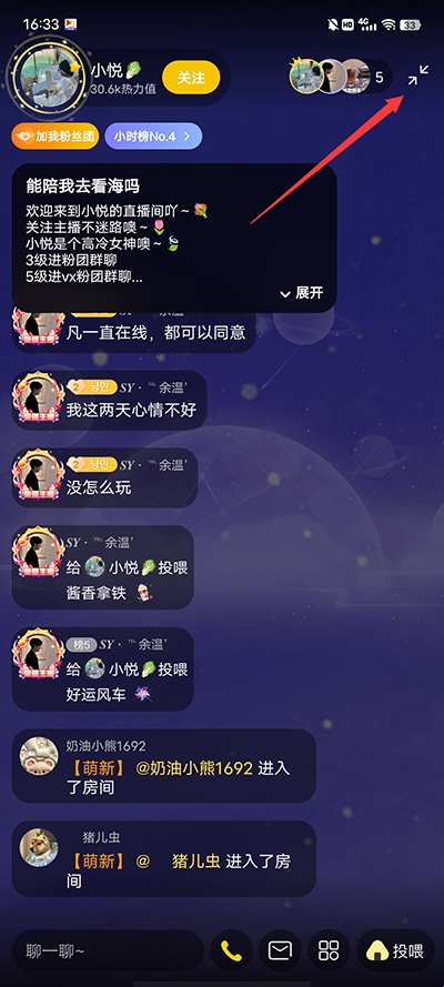 1、打开唱鸭APP直播房间,点击右上角“最小化”图标。