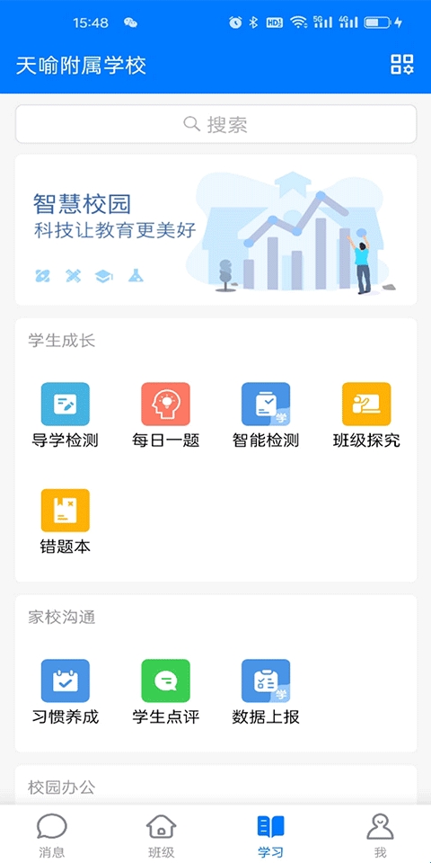 2、学习:导学检测、每日一题、智能检测,助力学生成长,习惯养成、学生点评、数据上报,家长即刻知悉;