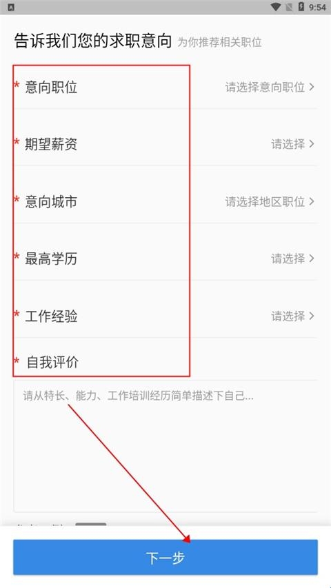4、接下来用户需要填写自己的求职意向,包括职位、薪资、学历等信息,然后点击下一步。