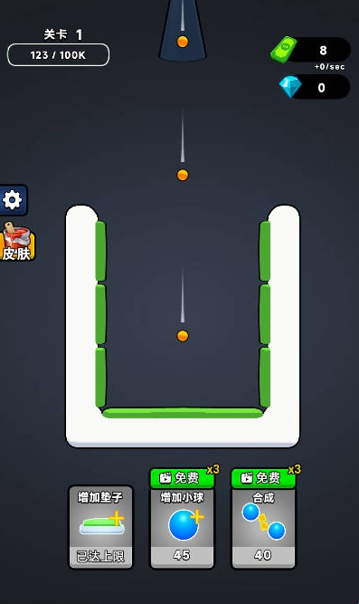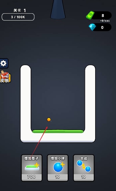 1、小球堆积与金币获取:通过点击操作持续增加容器内小球数量,利用小球碰撞垫子的机制提升金币获取速度,数量与速度呈正相关,考验玩家对堆积节奏的把控。