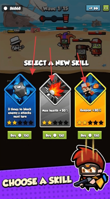 3、“技能选择”,每波(Wave1/15)后,花费金币选技能(格挡、血量、闪避),强化角色闯关。
