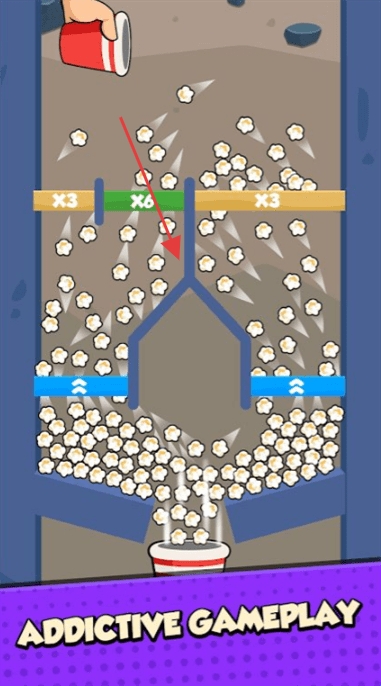 2、“爆米花收集”,在管道场景,引导爆米花流动,通过倍数区域(x3、x6),收集更多道具。