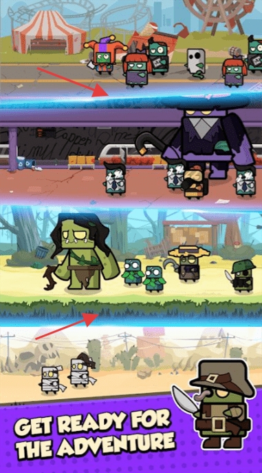 1、“冒险闯关”,操控卡通僵尸/英雄,遍历游乐场、野外等场景,推进关卡,遭遇敌人战斗。