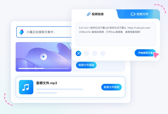 上传视频链接,支持抖音快手等几十家视频平台链接,操作简单一键解析视频,轻松提取视频。助你增加工作效率创作无忧!