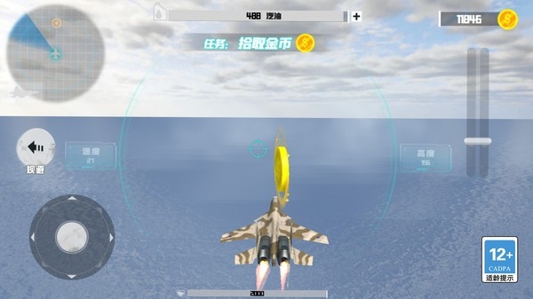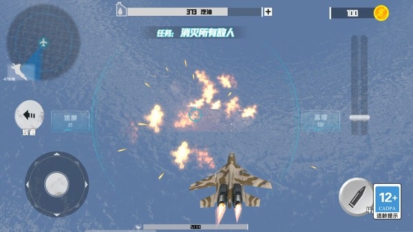 1、通过虚拟双摇杆操作,左手控制战机姿态转向、翻滚,右手调节高度、瞄准并发射武器,实现全手动空战操控。