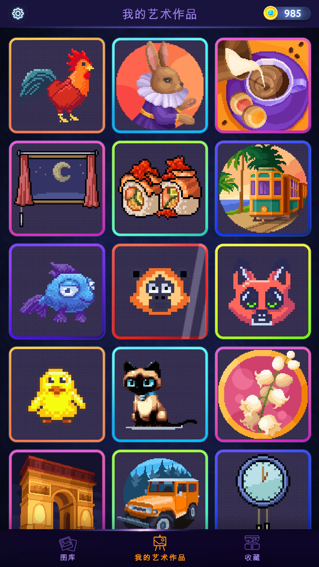 1、填色完成的作品自动保存至图库,玩家可随时查看、收藏,还能分享作品展示自己的色彩创作成果。