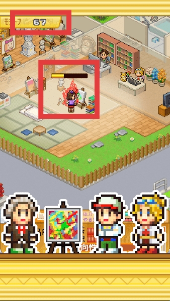 1、游戏中留意左上角的金钱数值(如67),合理规划资金用于支持绘画创作等活动。