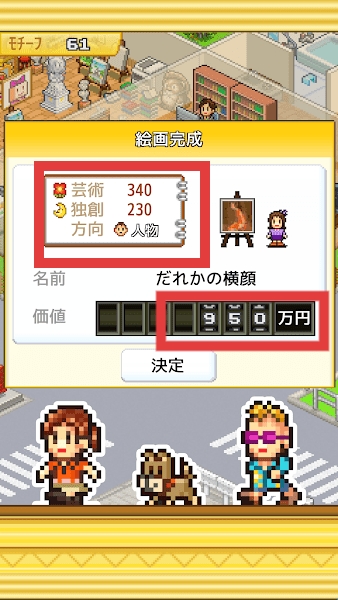 3、画作完成后,查看艺术、独创属性数值及画作方向和价值,根据结果总结经验,调整后续创作策略,不断提升绘画水平和收益。