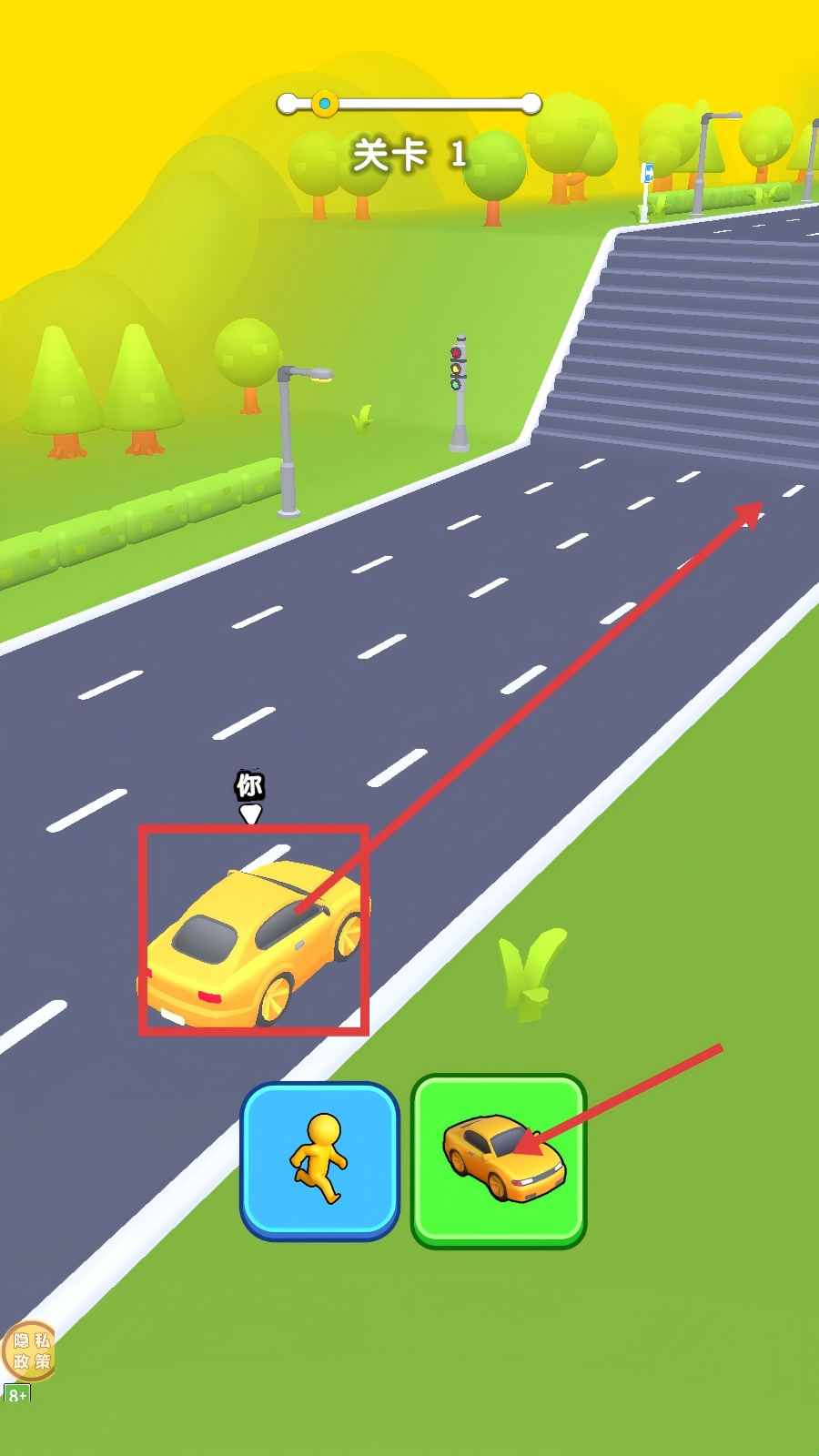 2、在道路上,点击绿色汽车图标,切换为黄色汽车,驾驶汽车沿道路向目标前进。