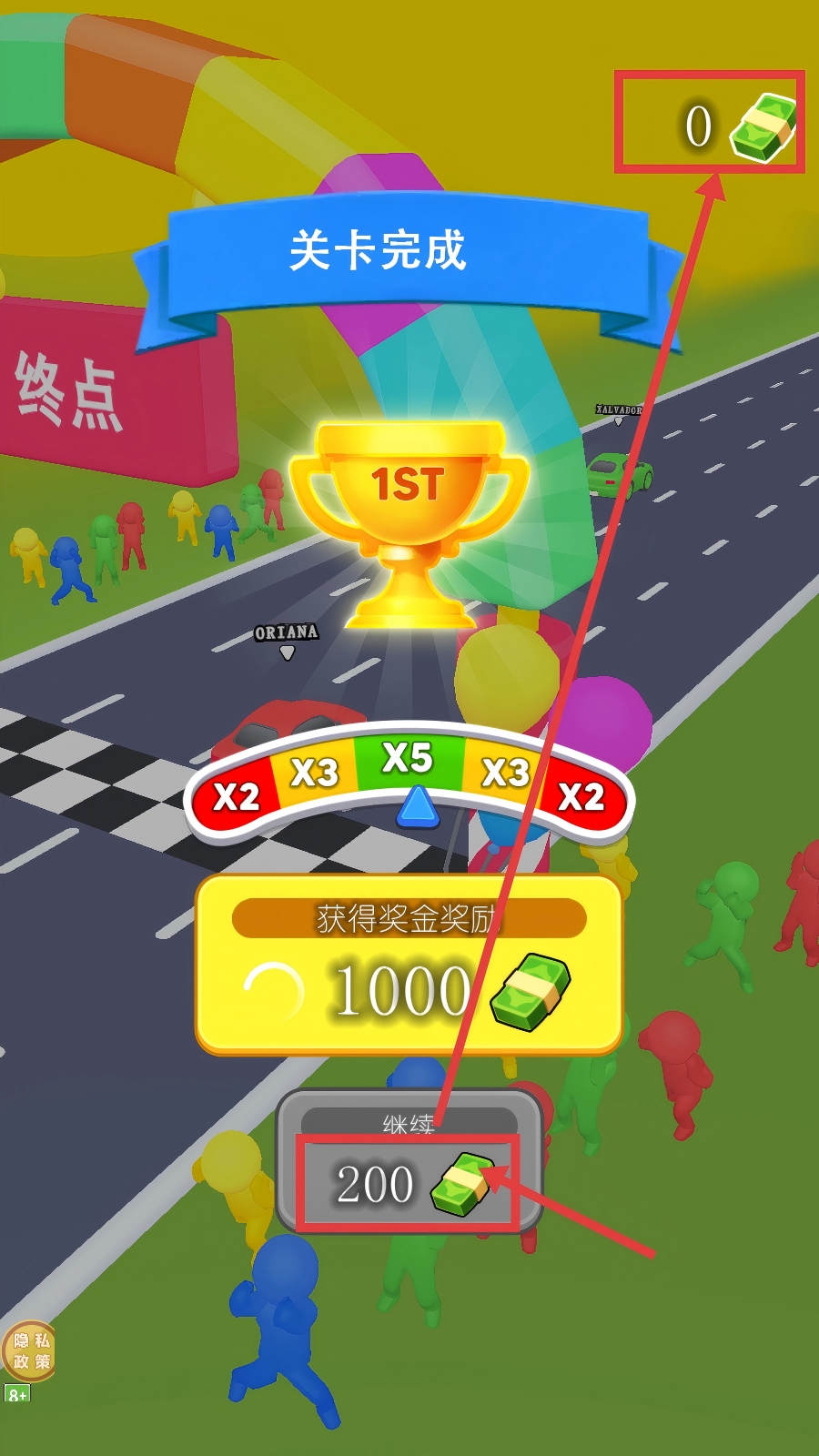 4、成功到达终点后,关卡完成,可获得【200】【1000】等奖金奖励,点击继续开启后续关卡。