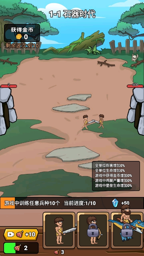 2、用战斗获得的金币升级食物生产速度,加快出兵效率,同时提升基地生命值,增强部落生存能力,为后续战斗铺垫。