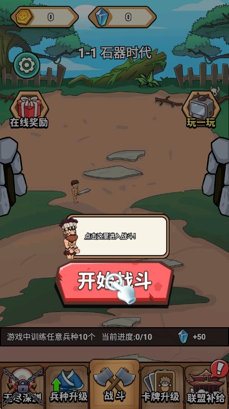 1、进入游戏后,从石器时代起步,训练基础兵种手持石斧的原始人战士,积累足够士兵后迎战敌人,开启部落战斗之旅。