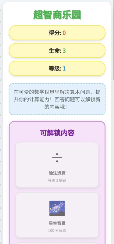 超智商乐园是一款为儿童专门打造的休闲益智游戏,游戏里孩子们可以通过触屏点击或拖拽的方式,选择正确的数字或符号来完成数学题目,答对题目即可解锁新的乐园区域或收集可爱勋章,给予孩子持续探索的动力,游戏将枯燥的数学运算转化为有趣的游戏任务,激发孩子内在学习兴趣,增强学习成就感。