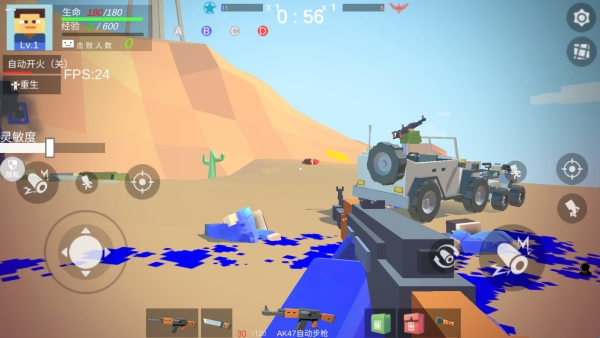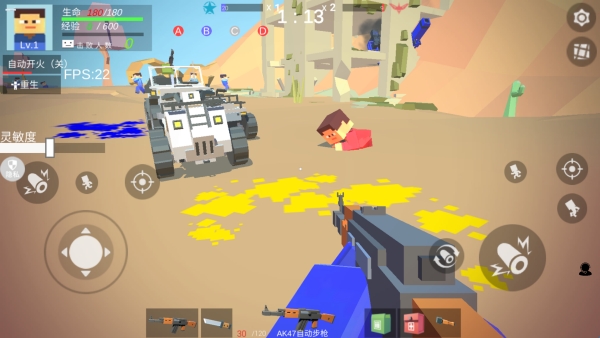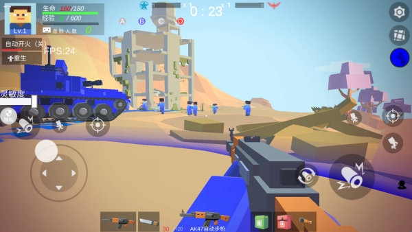 1、用虚拟摇杆控制战士移动,开启自动瞄准锁定附近敌人。
