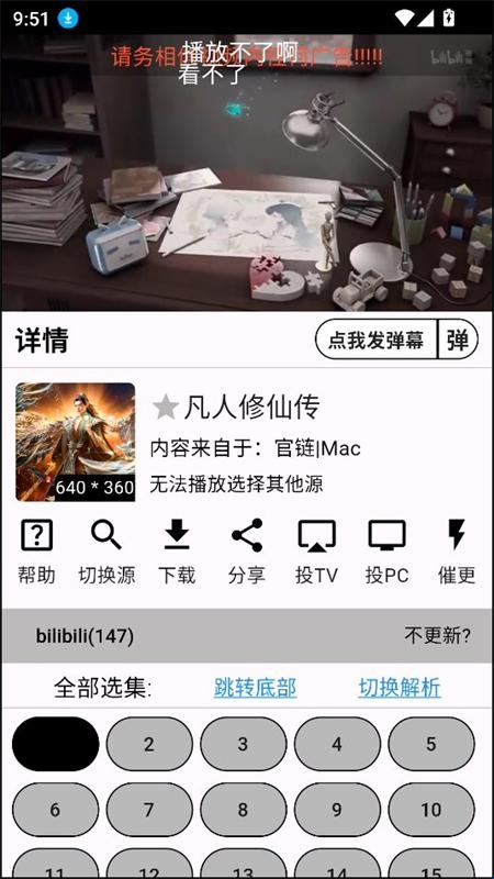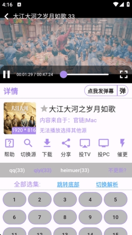3、点击进入便可以直接播放了,这款软件不仅支持弹幕而且更是加入了切换源、下载、分享、投TV、投PC等一系列功能。