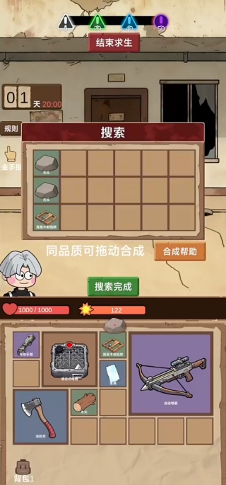 两件相同品质的物资道具可以进行合成,材料类型物品没有战斗能力,但是耐久无限;设施类型物品,拥有战斗能力,具备有限的耐久值,每过一天将会消耗1点耐久值;合成时有概率失败,成功则获得1件随机更高品质道具,具体合成概率请查看游戏内说明。