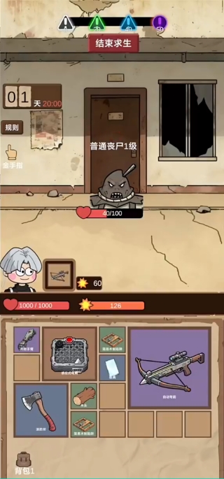 白天时,每次探索将推进游戏时间进度,当每日20:00时,将迎来怪物入侵,选择战斗后,背包中的设施将按照顺序依次对怪物进行攻击,若所有设施攻击后,怪物未被击败,则会按照剩余血量,对玩家造成伤害值。