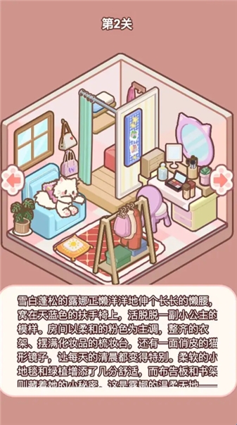 3、房间风格多样化:每个关卡都是独特房间,涵盖温馨卧室、时尚客厅等不同风格,满足玩家对多样喵居的装饰期待。