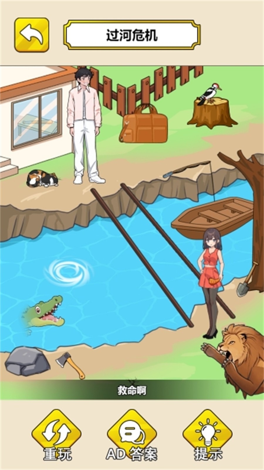 2、进入关卡后,需仔细观察场景,找出可移动的物品,思考物品功能与过河需求的关联,规划过河路径。