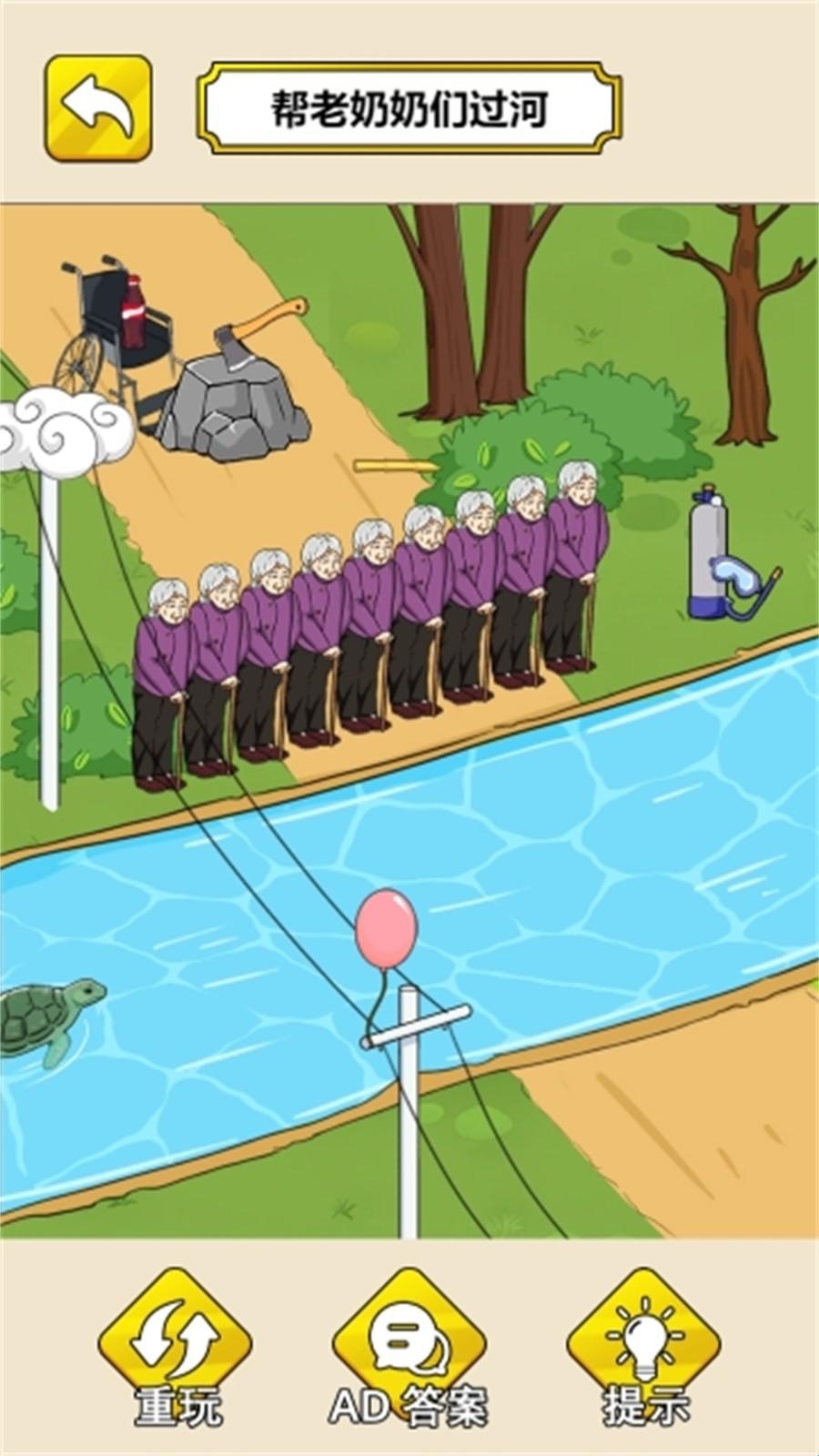 1、主打脑洞创意与烧脑解谜结合,打破常规思维模式,需用意想不到的物品组合助力老奶奶过河。