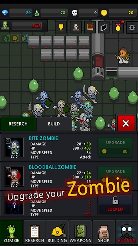 3、可派遣僵尸狩猎,获取金钱与材料,这些资源用于升级研究所和解锁变异僵尸。