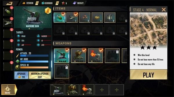 2、在进入关卡前玩家可以选择本关使用的炮塔和战术支援,选好后就可以点击play开始游玩。