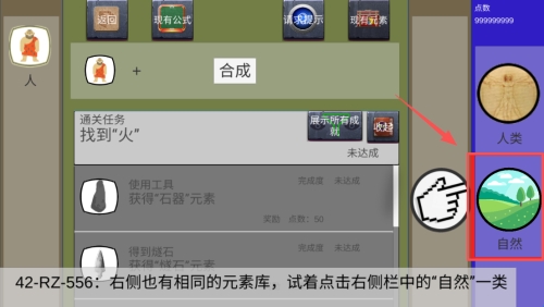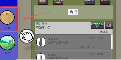 1、点蓝色区人类自然选元素,或点绿色合成按钮,或看下方未达成任务与奖励点数。